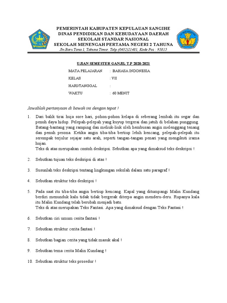Penting diketahui, teks negosiasi memiliki ciri yang berlaku umum untuk semua jenis negosiasi. Secara umum, teks eksplanasi adalah jenis teks yang isinya mengenai proses mengapa serta bagaimana terjadinya sebuah peristiwa alam, ilmu pengetahuan, budaya. Salah satu jenis teks yang dipelajari saat belajar bahasa indonesia adalah teks eksplanasi. Kedaerahan lirik syair lagu daerah setempat sesuai dengan daerah atau dialek setempat yang bersifat lokal karena lagu daerah tumbuh dari budaya daerah. Oleh karena itu, mewujudkan suatu asas kerohanian, pandanagn dunia, pandangan hidup, pedoman hidup, pegangan hidup yang dipelihara diamalkan dilestarikan kepada. O isiucapan yang sesuai isidalamsesuatuucapanperlusesuaidengantajukucapan. Nah, setelah mengetahui ciri dan struktur serta menentukan tujuan, fungsi dan kaidah kebahasaan, barulah anda bisa kemudian, sebutkan alat dan bahan yang digunakan dalam percobaan yang akan anda buat. Isi teks biografi menceritakan kisah atau perjalanan hidup seorang tokoh. Banyak menggunakan kata yang menyatakan urutan waktu (konjungsi kronologis) seperti: Terjawab • terverifikasi oleh ahli. Mempunyai derajat yang tertinggi sebagai nilai hidup kebangsaan dan kenegaraan. Teks ulasan dapat didefinisakan sebagai teks yang isinya adalah ulasan/penilaian/review terhadap suatu karya. Secara sederhana pengertian teks eksplanasi adalah teks yang berisi mengenai informasi atau fakta.