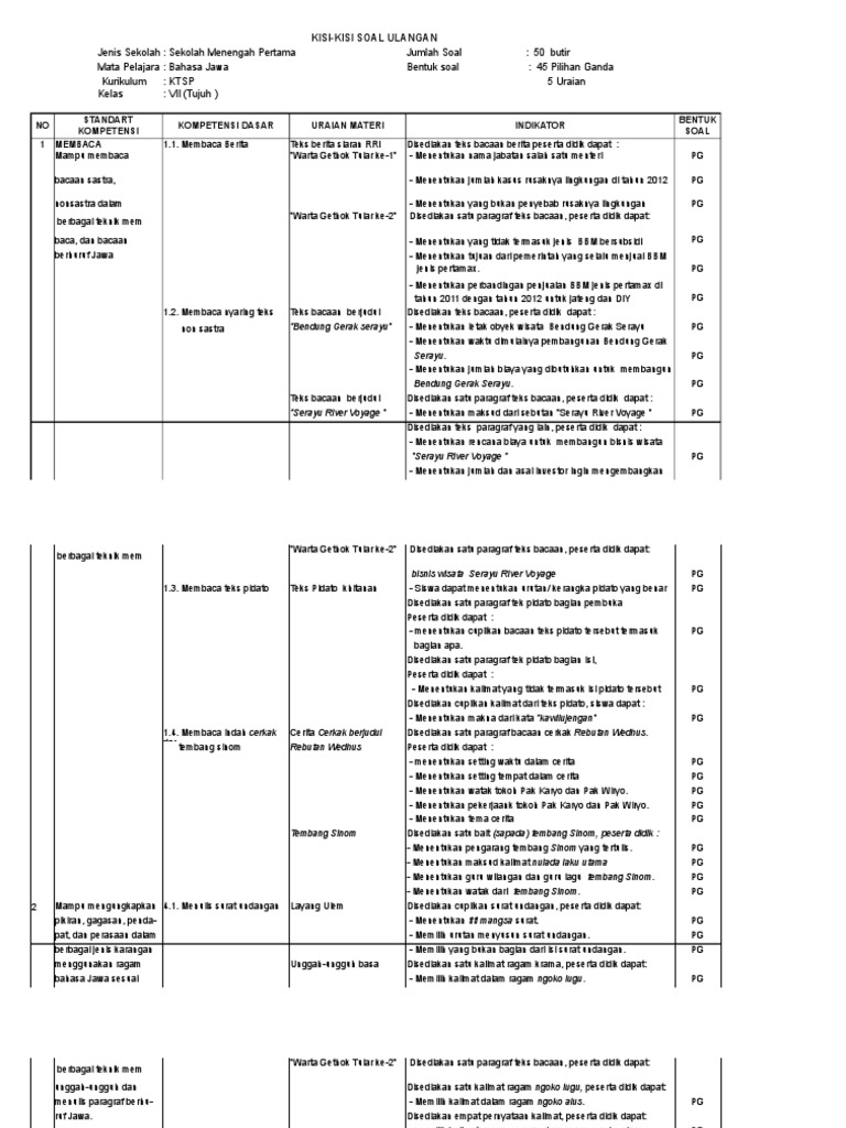Soal pts mata pelajaran bahasa jawa kelas 6 semester 1 terdiri dari soal pilihan ganda isian singkat dan uraian. Jumlah soal pilihan ganda : Artikel bahasa jawa wayang bausastra/kamus b.jawa berkenang daftar isi artikel/essay jawa essay/artikel jawa geguritan jawa sd kumpulan cerkak kumpulan materi b. ꦧꦱꦗꦮ ) adalah bahasa yang digunakan penduduk bersuku bangsa jawa di jawa tengah, yogyakarta, dan jawa timur. Wohing kasusastran jawa kang nyaritakake lakune paraga ing saperangan urip kang nabet (berkesan) lan biasane ora luwih saka 5000 tembung diarani ….