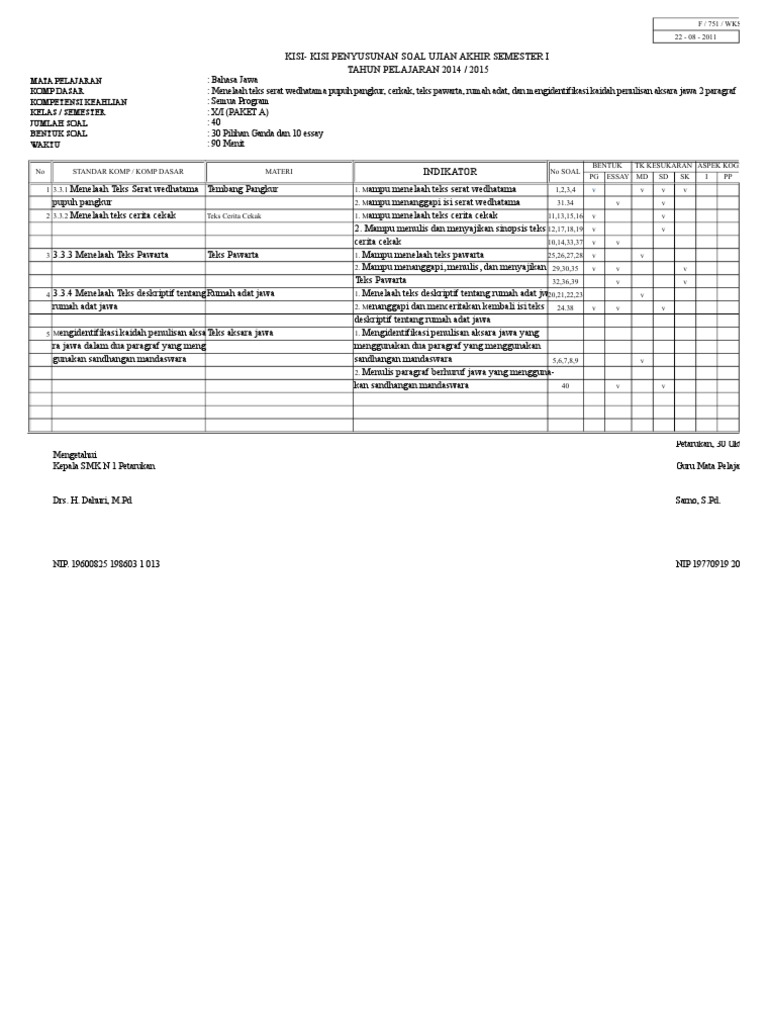 Http Repositori Kemdikbud Go Id 2069 1 Relevansi 20perubahan 20sosial 20budaya 20 26 20perkembangan 20sastra 20jawa 20tahun 201981 1997 20 282005 29 Pdf from Belajar bahasa jawa on line. Jumlah soal pilihan ganda : Meper hawa napsu supaya duwe kekuwatan lair batin, dalam aksara jawa yaitu.latihan soal pilihan ganda mata pelajaran bahasa jawa kelas 10 semester 1 kurikulum 2013 beserta jawabannya dan 5 soal uraian atau essai. 4 contoh soal aksara jawa pilihan ganda soal plh kelas 9 semester 1 dan kunci jawaban contoh soal dan jawaban btq. Wohing kasusastran jawa kang nyaritakake lakune paraga ing saperangan urip kang nabet (berkesan) lan biasane ora luwih saka 5000 tembung diarani …. Soal bahasa jawa kelas 4 sd/mi piwulang 2 crita wayang yudhistira ~ sekolahmuonline.com.pembaca sekolahmuonline, berikut ini sekolahmuonline sajikan contoh soal bahasa jawa kelas 4 sekolah dasar (sd) dan madrasah ibtidaiyah (mi) lengkap dengan kunci jawabannya. Teknik penulisan soal pilihan ganda pg sesuai kurikulum 2013. Maka judul artikel di buat seperti itu.